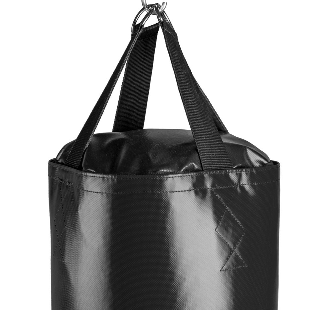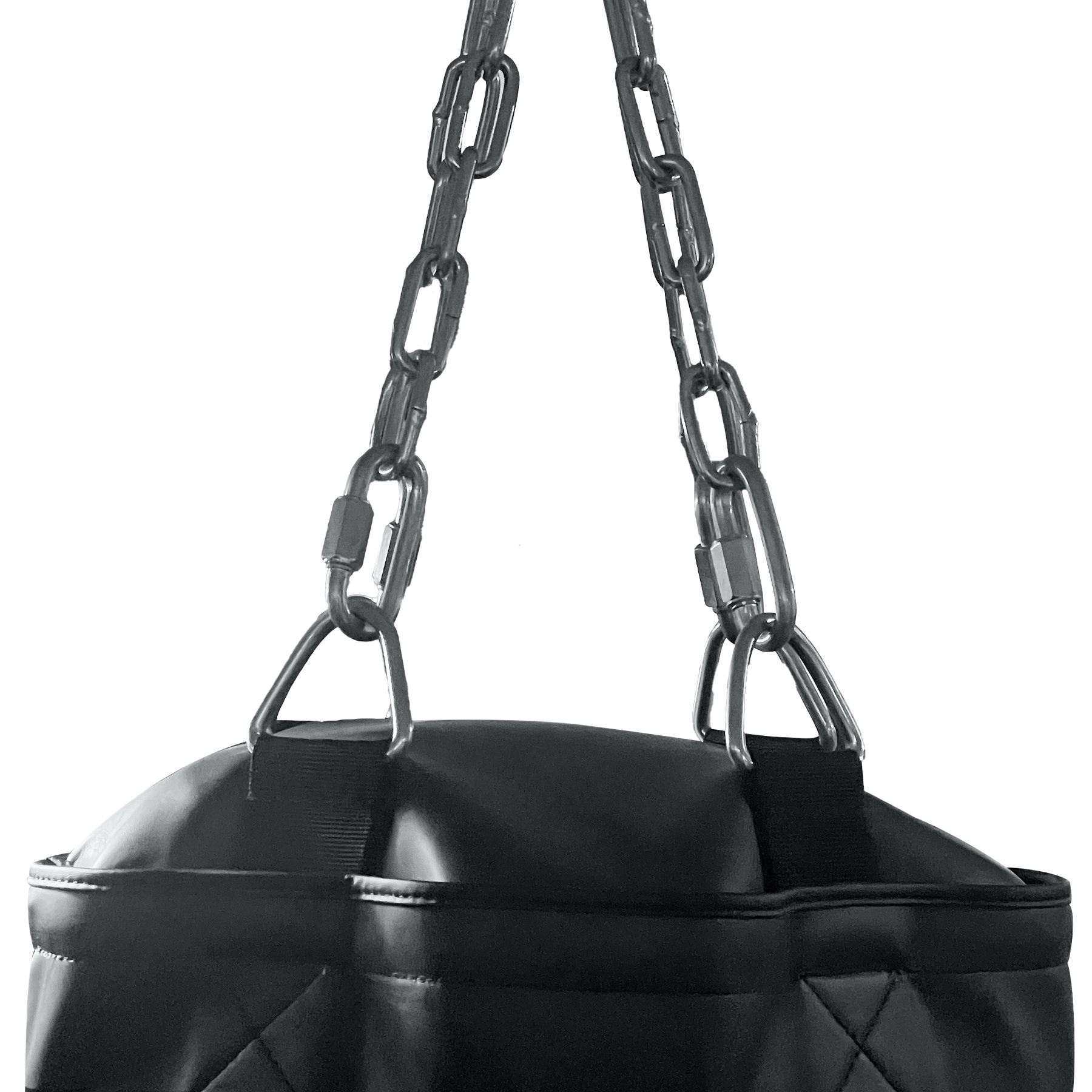 Die speziell entwickelte Mehrschichtfüllung aus Gummi- und EVA-Material sorgt für eine gleichmäßige Schlaghärte ohne Einsacken oder Verdichtung. Durch das 4-Punkt-Ketten- oder Gurt-Aufhängungssystem mit Karabinerhaken hängt der Sandsack stabil und sicher, selbst bei starken Kombinationsangriffen.
